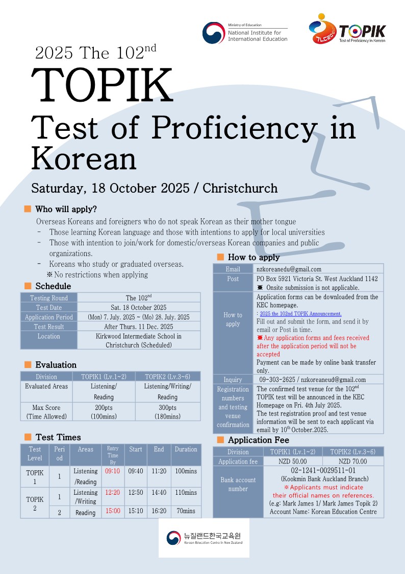 TOPIK is conducted two times every year in New Zealand: The first test takes place in Auckland in April, and the second one in Christchurch in October. (The test can be cancelled in case of fewer than ten applicants apply).