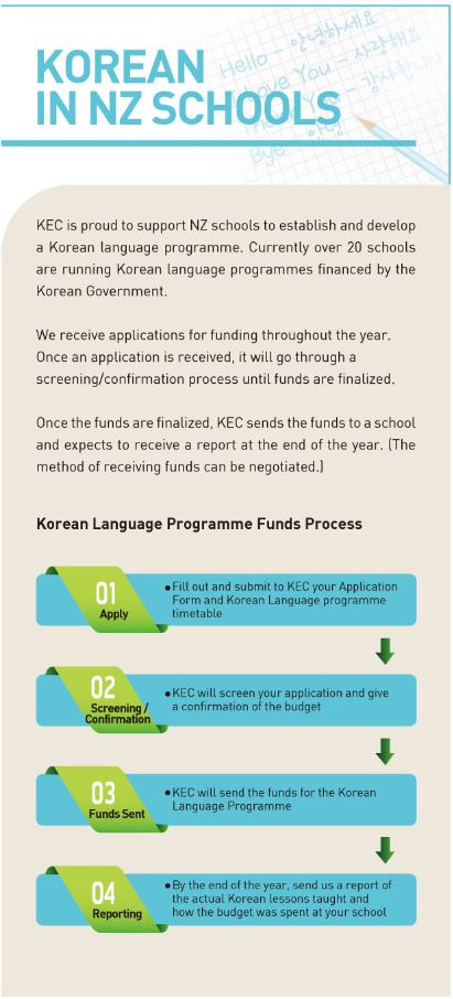 The Korean Education Centre (KEC) is proud to support NZ schools to establish and develop a Korean language programme. Currently over 20 schools are running Korean language programmes financed by the Korean Government.