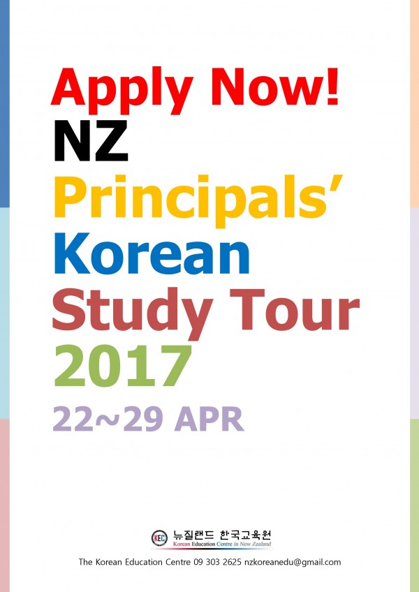 The Korean Education Centre (KEC) is pleased to announce the NZ Principals’ Korean Study Tour 2017 (NZPKST). The tour will consist of up to 12 principals/deputy principals, and they will be travelling around Korea, visiting Korean schools and educational organisations between 22~29 April 2017.