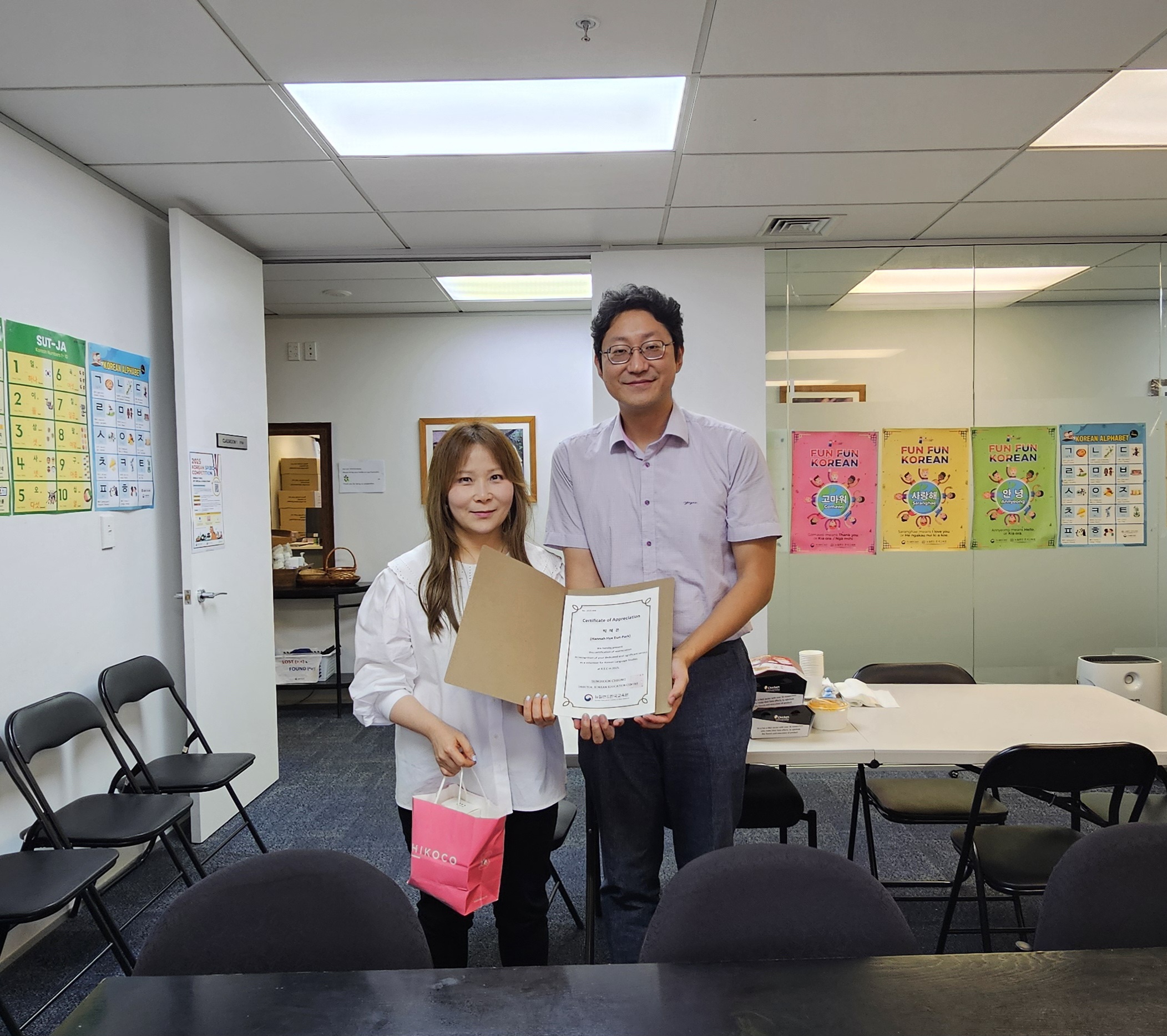 뉴질랜드한국교육원(원장 정성훈)은 2025년 한 해 동안 한국어 강좌 운영에 기여한 우수 자원봉사자를 각 반별 교사 추천을 통해 시상했습니다. 시상식에서 정성훈 원장은 봉사자들의 헌신과 노고에 감사를 표하고, 앞으로도 교육원 사업과 한국어 교육 발전을 위해 지속적인 관심과 지원을 당부했습니다.