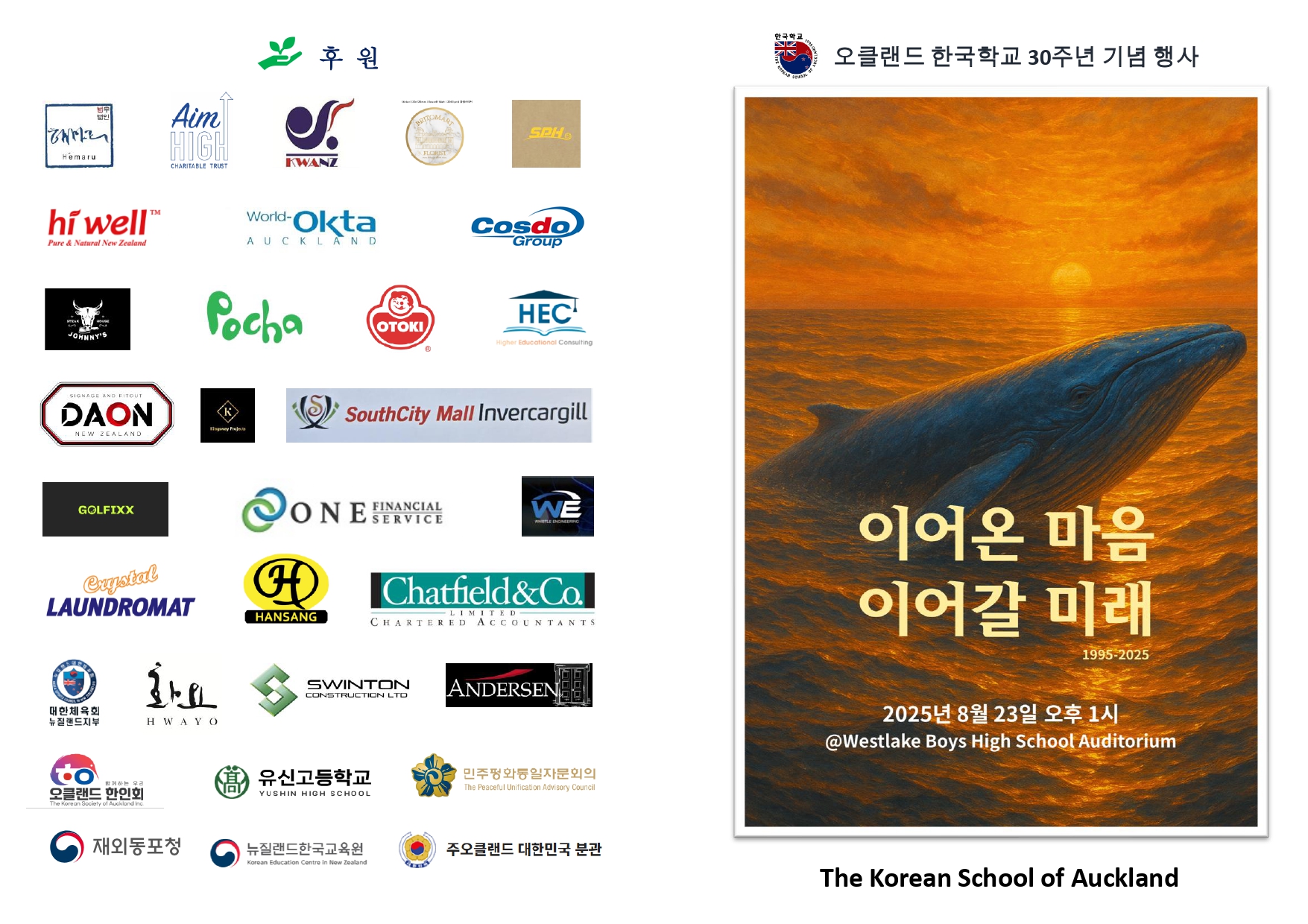 뉴질랜드한국교육원(원장 정성훈)은 8월 23일 토요일 Westlake Boys High School에서 오클랜드한국학교 개교 30주년 기념행사에 참석하여 관계자들과 학생, 학부모들을 격려했다고 밝혔습니다. 이 자리에서 정성훈 원장은 재외동포 자녀들이 한국어와 문화를 잊지 않도록 한글학교 지원에 많은 관심과 노력을 기울이겠다고 밝혔습니다. 기념행사 뒤에는 한글학교 교사, 학부모들을 대상으로 의견수렴을 가지는 기회도 가졌습니다.