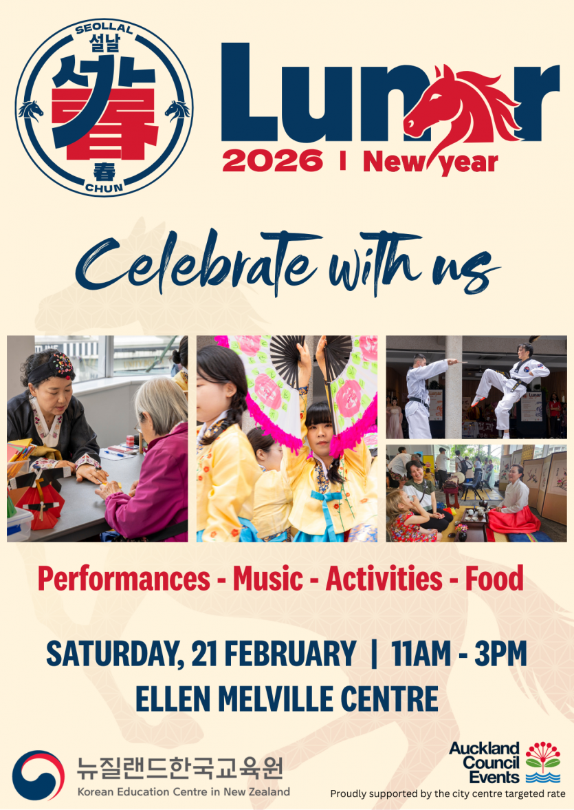 2026년 오클랜드시와 뉴질랜드한국교육원이 공동 주최한 설날 행사가 2월 21일에 성황리에 개최되었습니다.