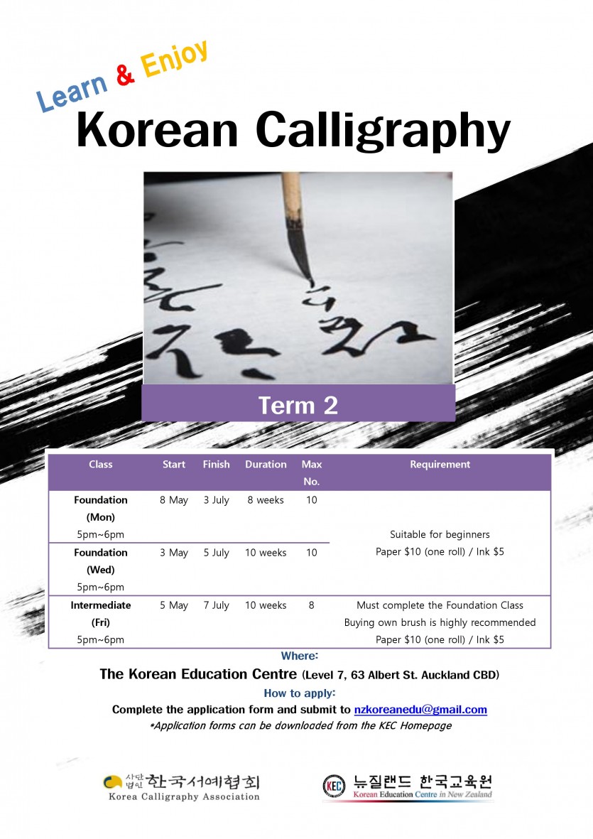 Term 2 Korean Calligraphy Class 교육원관리자 0 6765 2017.03.27 12:57 2017.03.27 12:57 2017 T2 Korean Language Class application form.docx (74.8K) + 31 This is a wonderful opportunity to explore and experience the Korean Calligraphy. Limited space available to register. Classes are on Mondays, Tuesdays and Fridays in Term 2. Please submit your application form by 7 April 2017.