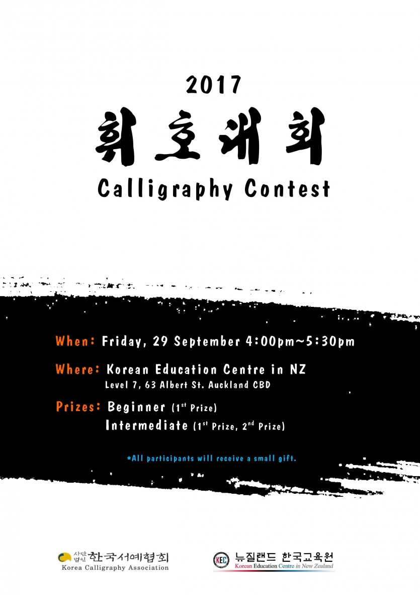 2017 휘호대회 Calligraphy Contest 교육원관리자 0 7225 2017.09.06 13:08 2017 휘호대회 Calligraphy Contest When: Friday, 29 September 4:00pm~5:30pm Where: Korean Education Centre in NZ Level 7, 63 Albert St. Auckland CBD Prizes: Beginner (1st Prize) Intermediate (1st Prize, 2nd Prize)